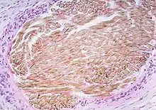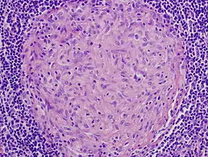 | Picture of a granuloma (without necrosis) as seen through a microscope on a glass slide. The tissue on the slide is stained with two standard dyes (hematoxylin: blue, eosin: pink) to make it visible. The granuloma in this picture was found in a lymph node of a patient with Mycobacterium avium infection | |