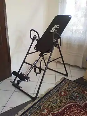 Inversion therapy, or simply inversion, is the process of seeking therapeutic benefits from hanging by the legs, ankles, or feet in an inverted angle or entirely upside down. It is a form of spinal traction.[1] Gravity boots are ankle supports designed for inversion therapy.[2] Some people use gravity boots to add an extra challenge to workouts, doing inverted crunches or squats.[3]