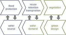 Within an urban context, this can be applied to re-introducing natural waterways[63] and making a city self-sustaining particularly with regard to water, for example, to harvest water locally, recycle it, re-use it and integrate stormwater management into everyday infrastructure.[64]