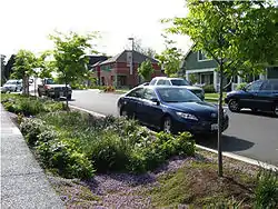 Bioswales are stormwater runoff systems providing an alternative to traditional storm sewers. Much like rain gardens, bioswales are vegetated or mulched channels commonly placed in long narrow spaces in urban areas. They absorb flows or carry stormwater runoff from heavy rains into sewer channels or directly to surface waters.[53] Vegetated bioswales infiltrate, slow down, and filter stormwater flows that are most beneficial along streets and parking lots.[31]