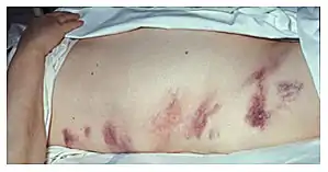 Grey Turner's sign refers to bruising of the flanks, the part of the body between the last rib and the top of the hip. The bruising appears as a blue discoloration,[1] and is a sign of retroperitoneal hemorrhage, or bleeding behind the peritoneum, which is a lining of the abdominal cavity. Grey Turner's sign takes 24–48 hours to develop, and can predict a severe attack of acute pancreatitis.[2]