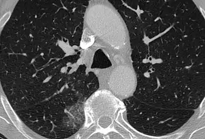 Ground-glass opacity (GGO) is a finding seen on chest x-ray (radiograph) or computed tomography (CT) imaging of the lungs. It is typically defined as an area of hazy opacification (x-ray) or increased attenuation (CT) due to air displacement by fluid, airway collapse, fibrosis, or a neoplastic process.[1] When a substance other than air fills an area of the lung it increases that area's density. On both x-ray and CT, this appears more grey or hazy as opposed to the normally dark-appearing lungs. Although it can sometimes be seen in normal lungs, common pathologic causes include infections, interstitial lung disease, and pulmonary edema.[2][3]