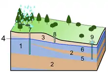 An illustration showing ground water and tree different wells (7, 8, 9) to reach it