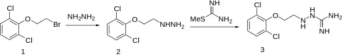 When β-(2,6-dichlorophenoxy)ethyl bromide (1) is reacted with hydrazine to give 2, and this is reacted with S-methylthiourea, guanochlor (3) results.[2][3]