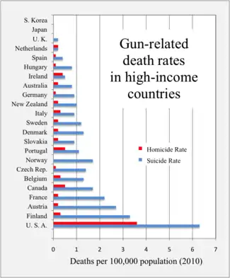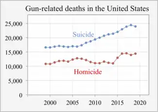 There is a strong relationship between guns in the home, as well as access to guns more generally, and suicide risk, the evidence for which is strongest in the United States.[22][23] In 2017, almost half of the nation's 47,173 suicides involved a firearm.[24] A 1992 case-control study conducted in Tennessee and Washington found that individuals in a firearm owning home are close to five times more likely to commit suicide than those individuals who do not own firearms.[25] A 2002 study found that access to guns in the home was associated with an increased risk of suicide among middle-aged and older adults, even after controlling for psychiatric illness.[26] As of 2008, there were 12 case-control studies that had been conducted in the U.S., all of which had found that guns in the home were associated with an increased risk of suicide.[27] However, a 1996 New Zealand study found no significant relationship between household guns and suicide.[28] Assessing data from 14 developed countries where gun ownership levels were known, the Harvard Injury Control Research Center found statistically significant correlations between those levels and suicide rates. However, the parallels were lost when data from additional nations was included.[29]:30 A 2006 study found a significant effect of changes in gun ownership rates on gun suicide rates in multiple Western countries.[30] During the 1980s and 1990s, the rate of adolescent suicides with guns caught up with adult rates, and the 75-and-older rate rose above all others.[9]:20–21[31] A 2002 study found that 90% of suicide attempts with firearms were successful.[32]