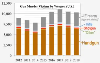 In 2010, 67% of all homicides in the U.S. were committed using a firearm.[98] In 2012, there were 8,855 total firearm-related homicides in the US, with 6,371 of those attributed to handguns.[99] In 2012, 64% of all gun-related deaths in the U.S. were suicides.[100] In 2010, there were 19,392 firearm-related suicides, and 11,078 firearm-related homicides in the U.S.[101] In 2010, 358 murders were reported involving a rifle while 6,009 were reported involving a handgun; another 1,939 were reported with an unspecified type of firearm.[102]