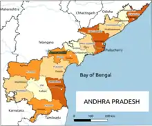 Guntur district is one of the nine districts in the Coastal Andhra region of the Indian state of Andhra Pradesh. The administrative seat of the district is located at Guntur, the largest city of the district in terms of area and with a population of 670,073.[3] It has a coastline of approximately 100 km (62 mi) on the right bank of Krishna River, that separates it from Krishna district and extends till it empties into the Bay of Bengal. It is bounded on the south by Prakasam district and on the west by the state of Telangana.[4] It has an area of 11,391 km2 (4,398 sq mi) and is the 2nd most populous district in the state, with a population of 4,889,230 as per 2011 census of India.[5][6]