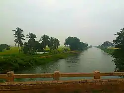 Guntur district occupies an area of approximately 19,391 square kilometres (7,487 sq mi),[16] comparatively equivalent to Indonesia's Bangka Island.[17] The Krishna River forms the northeastern and eastern boundary of the district, separating it from Krishna district. The district is bounded on the southeast by the Bay of Bengal, on the south by Prakasam district, on the west by Mahabub Nagar district, Telangana and on the northwest by Nalgonda district, Telangana.