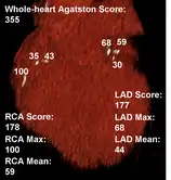 The Agatston score, named after its developer Arthur Agatston, is a measure of calcium on a coronary CT calcium scan.[7] The original work was based on electron beam computed tomography (also known as ultrafast CT or EBCT). The score is calculated using a weighted value assigned to the highest density of calcification in a given coronary artery. The density is measured in Hounsfield units, and score of 1 for 130–199 HU, 2 for 200–299 HU, 3 for 300–399 HU, and 4 for 400 HU and greater. This weighted score is then multiplied by the area (in square millimeters) of the coronary calcification. For example, a "speck" of coronary calcification in the left anterior descending artery measures 4 square millimeters and has a peak density of 270 HU. The score is therefore 8 (4 square millimeters × weighted score of 2). The tomographic slices of the heart are 3 millimeters thick and average about 50–60 slices from the coronary artery ostia to the inferior wall of the heart. The calcium score of every calcification in each coronary artery for all of the tomographic slices is then summed up to give the total coronary artery calcium score (CAC score).