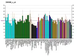 HFE is prominent in small intestinal absorptive cells,[10][11] gastric epithelial cells, tissue macrophages, and blood monocytes and granulocytes,[11][12] and the syncytiotrophoblast, an iron transport tissue in the placenta.[13]
