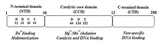1. Amino (N)-terminal domain: Sometimes referred to as a "zinc finger", the N-terminal domain is composed of the conserved HHCC, His, and Cys residues, a motif that serves to bind zinc. The function of the N-terminal domain is not completely clear, but is thought to assist the integrase in forming multimers (fixed agglomerations of multiple integrase molecules).