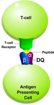 HLA DQ functions as a cell surface receptor for foreign or self antigens. The immune system surveys antigens for foreign pathogens when presented by MHC receptors (like HLA DQ). The MHC Class II antigens are found on antigen presenting cells (APC) (macrophages, dendritic cells, and B-lymphocytes). Normally, these APC 'present' class II receptor/antigens to a great many T-cells, each with unique T-cell receptor (TCR) variants. A few TCR variants that recognize these DQ/antigen complexes are on CD4 positive (CD4+) T-cells. These T-cells, called T-helper cells, can promote the amplification of B-cells which, in turn recognize a different portion of the same antigen. Alternatively, macrophages and other megalocytes consume cells by apoptotic signaling and present self-antigens. Self antigens, in the right context, form a regulatory T-cell population that protects self tissues from immune attack or autoimmunity.