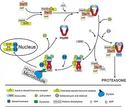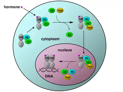 The glucocorticoid receptor (GR) is the most thoroughly studied example of a steroid receptor whose function is crucially dependent on interactions with Hsp90.[50][51] In the absence of the steroid hormone cortisol, GR resides in the cytosol complexed with several chaperone proteins including Hsp90 (see figure to the right). These chaperones maintain the GR in a state capable of binding hormone. A second role of Hsp90 is to bind immunophilins (e.g., FKBP52) that attach the GR complex to the dynein protein trafficking pathway, which translocates the activated receptor from the cytoplasm into the nucleus.[52] Once in the nucleus, the GR dimerizes and binds to specific sequences of DNA and thereby upregulates the expression of GR responsive genes. Hsp90 is also required for the proper functioning of several other steroid receptors, including those responsible for the binding of aldosterone,[53] androgen,[54] estrogen,[55] and progesterone.[56]