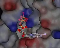 A common binding pocket for ATP and the inhibitor geldanamycin is situated in the N-terminal domain.[15][16] Amino acids that are directly involved in the interaction with ATP are Leu34, Asn37, Asp79, Asn92, Lys98, Gly121, and Phe124. In addition, Mg2+ and several water molecules form bridging electrostatic and hydrogen bonding interactions, respectively, between Hsp90 and ATP. In addition, Glu33 is required for ATP hydrolysis.