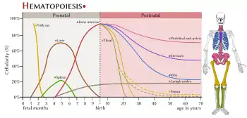 In developing embryos, blood formation occurs in aggregates of blood cells in the yolk sac, called blood islands. As development progresses, blood formation occurs in the spleen, liver and lymph nodes. When bone marrow develops, it eventually assumes the task of forming most of the blood cells for the entire organism.[2] However, maturation, activation, and some proliferation of lymphoid cells occurs in the spleen, thymus, and lymph nodes. In children, haematopoiesis occurs in the marrow of the long bones such as the femur and tibia. In adults, it occurs mainly in the pelvis, cranium, vertebrae, and sternum.[5]