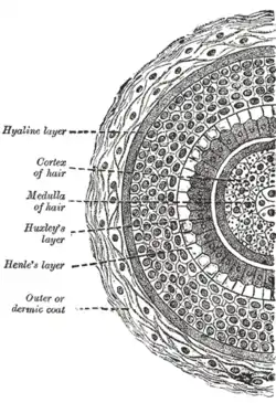 The root of the hair ends in an enlargement, the hair bulb, which is whiter in color and softer in texture than the shaft, and is lodged in a follicular involution of the epidermis called the hair follicle. The bulb of hair consists of fibrous connective tissue, glassy membrane, external root sheath, internal root sheath composed of epithelium stratum (Henle's layer) and granular stratum (Huxley's layer), cuticle, cortex and medulla.[9]