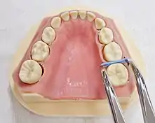 The stainless steel crowns are selected by tooth type, location and size (see image 2). The tooth will be measured to identify the most suitable size of stainless steel crown.[24] The clinician will try the stainless steel crown prior to its cementation, to ensure that it fits correctly, and establish if an alternative size or contouring of the stainless steel crown is required. When placing the stainless steel crown within the mouth, the airways will generally be protected by placing gauze around the site, or the clinician may secure the stainless steel with tape/Elastoplast.[24] Once a correct size/fit is established, the crown may be adhered to the tooth. The stainless steel crown is secured to the tooth by partially filling the stainless steel crown with a self curing glass ionomer cement and then placing over the tooth.[24] The stainless steel crown should "click" securely into place.[24] The patient is required to bite firmly onto a cotton roll or bite stick to secure it in the correct position whilst it sets.[24] The excess of glass ionomer cement will be wiped off or removed with knotted floss from between the interproximal contact, and a sickle probe from the buccal gingival sulcus on the buccal and lingual/palatal surfaces.[20]