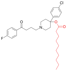 The decanoate ester of haloperidol (haloperidol decanoate, trade names Haldol decanoate, Halomonth, Neoperidole) has a much longer duration of action, so is often used in people known to be noncompliant with oral medication. A dose is given by intramuscular injection once every two to four weeks.[32] The IUPAC name of haloperidol decanoate is [4-(4-chlorophenyl)-1-[4-(4-fluorophenyl)-4-oxobutyl]piperidin-4-yl] decanoate.