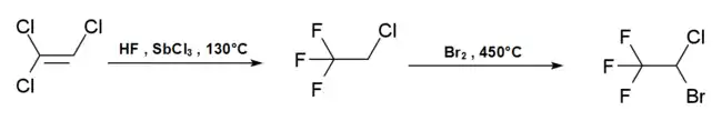 The commercial synthesis of halothane starts from trichloroethylene, which is reacted with hydrogen fluoride in the presence of antimony trichloride at 130 °C to form 2-chloro-1,1,1-trifluoroethane. This is then reacted with bromine at 450 °C to produce halothane.[19]