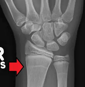 Growth arrest lines, also known as Harris lines, are lines of increased bone density that represent the position of the growth plate at the time of insult to the organism and formed on long bones due to growth arrest. They are only visible by radiograph or in cross-section. The age at which the lines were formed can be estimated from a radiograph. Harris lines are often discussed as a result of juvenile malnutrition, disease or trauma. Other studies suggest a reconsideration of Harris lines as more of a result of normal growth and growth spurts, rather than a pure outcome of nutritional or pathologic stress.[1] The term is named after Henry Albert Harris, 1886-1968, professor for anatomy at the University of Cambridge.