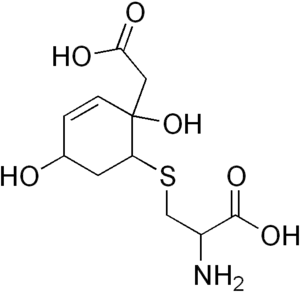 Normally, the breakdown of the amino acid tyrosine involves the conversion of 4-hydroxyphenylpyruvate to homogentisate by 4-Hydroxyphenylpyruvate dioxygenase. Complete deficiency of this enzyme would lead to tyrosinemia III. In rare cases, however, the enzyme is still able to produce the reactive intermediate 1,2-epoxyphenyl acetic acid, but is unable to convert this intermediate to homogentisate. The intermediate then spontaneously reacts with glutathione to form 2-L-cystein-S-yl-1,4-dihydroxy-cyclohex-5-en-1-yl acetic acid (hawkinsin).[3][4]