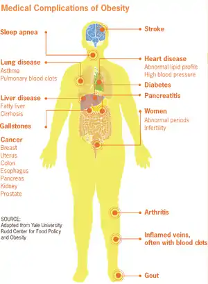 There is a considerable amount of evidence that being overweight is associated with increased all-causes mortality, and significant weight loss (>10%), using a variety of diets, improves or reverses metabolic syndromes and other health outcomes associated with overweight and obesity.[16][17][18][19] Obesity has been correlated with a wide variety of health problems.[17][4] These problems range from congestive heart failure,[20] high blood pressure,[21] deep vein thrombosis and pulmonary embolism,[22] type 2 diabetes,[23] infertility,[24] birth defects,[25] stroke,[26] dementia,[27] cancer,[28] asthma and chronic obstructive pulmonary disease[29] and erectile dysfunction.[30] A BMI greater than 30 is associated with twice the average risk of congestive heart failure.[31][32] Obesity is associated with cardiovascular diseases including angina and myocardial infarction.[33][34] A 2002 report concluded that 21% of ischemic heart disease is due to obesity,[35] while a 2008 European consensus puts the number at 35%.[36] Obesity has been cited as a contributing factor to approximately 100,000–400,000 deaths in the United States per year[37] (including increased morbidity in car accidents).[38]