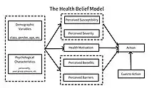 The health belief model (HBM)) is a social psychological health behavior change model developed to explain and predict health-related behaviors, particularly in regard to the uptake of health services.[1][2] The HBM was developed in the 1950s by social psychologists at the U.S. Public Health Service[2][3] and remains one of the best known and most widely used theories in health behavior research.[4][5] The HBM suggests that people's beliefs about health problems, perceived benefits of action and barriers to action, and self-efficacy explain engagement (or lack of engagement) in health-promoting behavior.[2][3] A stimulus, or cue to action, must also be present in order to trigger the health-promoting behavior.[2][3]