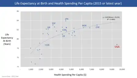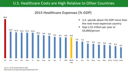Despite this spending, the quality of health care overall is low by OECD measures.[10] The Commonwealth Fund ranked the United States last in the quality of health care among similar countries.[11][12]