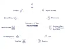 Prior to recent technological advances, most health data were collected within health care systems. As individuals move through health care systems, they interact with health care providers and this interaction produces health information. These touch points include, clinics/physician offices, pharmacies, payers/insurance companies, hospitals, laboratories, and senior homes. Information is also collected through participation in clinical trials, health agency surveys, medical devices, and genomic testing. This information, once recorded, becomes health data. This data typically includes a record of services received, conditions of those services, and clinical outcomes consequent of those services.[2] For example, a blood draw may be a service received, a white blood cell count may be a condition of that service, and a reported measurement of white blood cells may be an outcome of that service. Information also frequently collected and found in medical records includes, administrative and billing data, patient demographic information, progress notes, vital signs, medications diagnoses, immunization dates, allergies, and lab results.[5]
