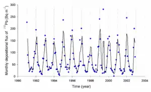 The radon (222Rn) released into the air decays to 210Pb and other radioisotopes. The levels of 210Pb can be measured. The rate of deposition of this radioisotope is dependent on the weather.