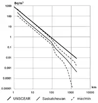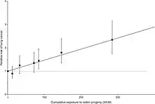 Epidemiologic radon studies have found trends to increased lung cancer risk from radon with a no evidence of a threshold, and evidence against a threshold above high as 150 Bq/m3 (almost exactly the EPA's action level of 4 pCi/L).[64] Another study similarly found that there is no evidence of a threshold but lacked the statistical power to clearly identify the threshold at this low level.[75] Notably, the latter deviance from zero at low level convinced the World Health Organization that, "The dose-response relation seems to be linear without evidence of a threshold, meaning that the lung cancer risk increases proportionally with increasing radon exposure."[76]