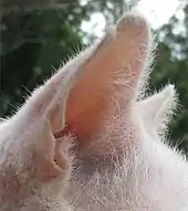 The hearing ability of a dog is dependent on breed and age, though the range of hearing is usually around 67 Hz to 45 kHz.[25][26] As with humans, some dog breeds' hearing ranges narrow with age,[27] such as the German shepherd and miniature poodle. When dogs hear a sound, they will move their ears towards it in order to maximize reception. In order to achieve this, the ears of a dog are controlled by at least 18 muscles, which allow the ears to tilt and rotate. The ear's shape also allows the sound to be heard more accurately. Many breeds often have upright and curved ears, which direct and amplify sounds.