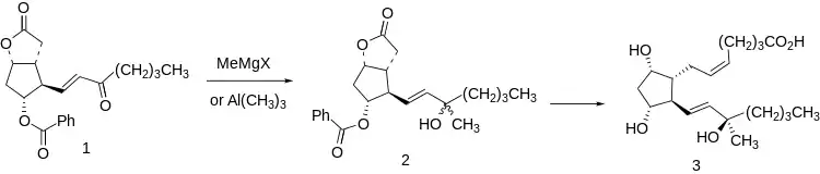 3. Yankee EW, Axen U, Bundy GL (September 1974). "Total synthesis of 15-methylprostaglandins". Journal of the American Chemical Society. 96 (18): 5865–76. doi:10.1021/ja00825a027. PMID 4416671.