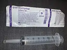 A 60cc/mL Toomey syringe. 1) Fill syringe with saline. 2) Connect syringe to a catheter port 3) Instill 180cc of saline 4) Draw back 180cc of bladder urine 5) Dispose of medical waste 6) Repeat until all clots are removed