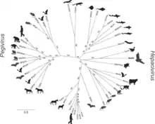 A virus related to the hepaciviruses has been isolated from bald eagles (Haliaeetus leucocephalus).[18] Another unclassified virus in this taxon is duck hepacivirus-like virus.[19] A virus related to hepaciviruses has been isolated from the graceful catshark (Proscyllium habereri).[20] The virus – Jogalong virus – has been described that appears to belong to another species in this genus.[21]