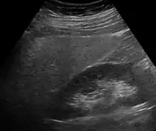 Ultrasound showing diffuse increased echogenicity of the liver.