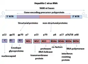At the 5′ and 3′ ends of the RNA are the untranslated regions (UTR), that are not translated into proteins but are important to translation and replication of the viral RNA. The 5′ UTR has a ribosome binding site[15] or internal ribosome entry site (IRES) that initiates the translation of a very long protein containing about 3,000 amino acids. The core domain of the HCV IRES contains a four-way helical Holliday junction that is integrated within a predicted pseudoknot.[16] The conformation of this core domain constrains the open reading frame's orientation for positioning on the 40S ribosomal subunit. The large pre-protein is later cleaved by cellular and viral proteases into the 10 smaller proteins that allow viral replication within the host cell, or assemble into the mature viral particles.[17] Structural proteins made by the hepatitis C virus include Core protein, E1 and E2; nonstructural proteins include NS2, NS3, NS4A, NS4B, NS5A, and NS5B.
