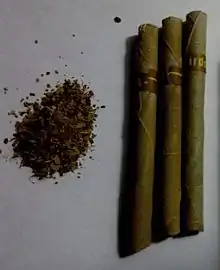Herbal cigarettes (also called tobacco-free cigarettes or nicotine-free cigarettes) are cigarettes that usually do not contain any tobacco or nicotine, instead being composed of a mixture of various herbs and/or other plant material.[1] However, Chinese herbal cigarettes contain tobacco and nicotine with herbs added, unlike European and North American herbal cigarettes which have tobacco and nicotine omitted.[2] Like herbal smokeless tobacco, they are often used as a substitute for standard tobacco products (primarily cigarettes). Herbal cigarettes are considered a "non-smoking aid."[3] European countries advertise herbal cigarettes as a cessation smoking aid.[1] Herbal cigarettes are also used in acting scenes by performers who are non-smokers, or—as is becoming increasingly common—where anti-smoking legislation prohibits the use of tobacco in public spaces.[4][5][6] Herbal cigarettes can carry carcinogens which can have health implications.[3]