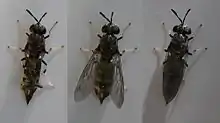 H. illucens is a mimic fly, very close in size, color, and appearance to the organ pipe mud dauber wasp and its relatives. The mimicry of this particular kind of wasp is especially enhanced in that the fly's antennae are elongated and wasp-like, the fly's hind tarsi are pale, as are the wasp's, and the fly has two small transparent "windows" in the basal abdominal segments that make the fly appear to have a narrow "wasp waist".[6] Black soldier fly larvae can be differentiated from blowfly or housefly larvae by a thin gray-black stripe on their posterior ends.