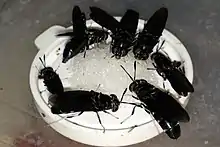 An adult female lays between 206 and 639 eggs at a time.[7] These eggs are typically deposited in crevices or on surfaces above or adjacent to decaying matter such as manure or compost and hatch in about 4 days.[8] Freshly emerged larvae are 1.0 millimetre (0.04 in), being able to reach a length of 25 millimetres (1 in) and weight of 0.10 to 0.22 grams (1.5 to 3.4 gr) by the end of larval stage.[6] The larvae are able to feed on a wide variety of organic matter,[9][10][11][12] adapting to diets with different nutrient content.[13] The larval stage lasts from 18 to 36 days, depending on the food substrates provided to the larvae,[7][14] of which the postfeeding (prepupal) stage lasts around 7 days.[15] The length of larval stage can be delayed by months due to low temperature or lack of food.[8] The pupal stage lasts from 1 to 2 weeks.[15][16] Adults can live typically 47 to 73 days when provided with water and food, such as sugar in captivity or nectar in the wild,[17][18] or survive for about 8 to 10 days on fat reserves gathered during larval stage when water is provided.[7]