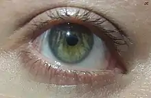Human example of central heterochromia in green eye with speckled brown pigment.