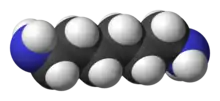 Hexamethylenediamine is the organic compound with the formula H2N(CH2)6NH2. The molecule is a diamine, consisting of a hexamethylene hydrocarbon chain terminated with amine functional groups. The colorless solid (yellowish for some commercial samples) has a strong amine odor. About 1 billion kilograms are produced annually.[4]