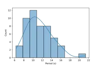 Histogram of period (in seconds) between each hiccup in a sequence of 50 samples in about 10 minutes. Mean: 11.40 s. Median: 10.715 s. Standard deviation: 2.88 s. Data set ranges from 6.28 s to 21.36 s.