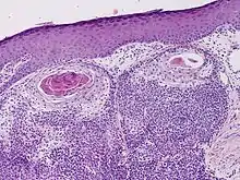 Hidradenocarcinoma (also known as malignant hidradenoma, malignant acrospiroma, clear cell eccrine carcinoma, or primary mucoepidermoid cutaneous carcinoma) is a malignant adnexal tumor of the sweat gland. It is the malignant variant of the benign hidradenoma. It may develop de novo or in association with an existent hidradenoma.[1]