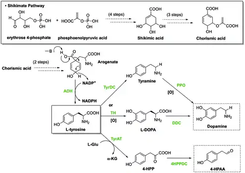 In plants, tyrosine is synthesized through Shikimate pathway, during which the last step involves decarboxylation and dehydrogenation of arogenate to give L-tyrosine. To generate dopamine from tyrosine, there are two pathways. In one pathway, tyrosine undergoes decarboxylation catalyzed by tyrosine decarboxylase (TyrDC) to become tyramine, which is then followed by oxidation of polyphenol oxidase (PPO) to render dopamine.[19][20] Alternatively, tyrosine can be oxidized by tyrosine hydroxylase (TH) to form L-DOPA, which is then later decarboxylated by DOPA decarboxylase (DDC) to provide dopamine. Besides that, the other starting material, 4-HPAA, is generated through a first transamination by tyrosine transeaminase (TyrAT) to form 4-hydroxylphenylpyruvate (4-HPP), and a subsequent decarboxylation by 4-HPP decarboxylase. [20]
