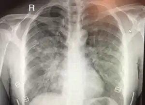 On physical exam, increased breathing rates, increased heart rates, and a low-grade fever 38.5o (101.3o F) are common.[8][3] Listening to the lungs may reveal crackles in one or both lungs, often starting in the right middle lobe.[8][3] Imaging studies such as X-ray and CT imaging of the chest may reveal thoracic infiltrates that can be seen as opaque patches.[13][8][3] One distinct feature of HAPE is that pulse oximetry saturation levels (SpO2) are often decreased from what would be expected for the altitude. People typically do not appear as ill as SpO2 and chest X-ray films would suggest.[8][3] Giving extra oxygen rapidly improves symptoms and SpO2 values; in the setting of infiltrative changes on chest X-ray, this is nearly pathognomonic for HAPE.[3]
