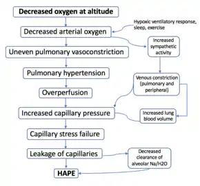 Though it remains a topic of intense investigation, multiple studies and reviews over the last several years have helped to elucidate the proposed mechanism of HAPE. The inciting factor of HAPE is the decrease in partial pressure of arterial oxygen caused by the lower air pressure at high altitudes (pulmonary gas pressures).[2][8][9] The resultant hypoxemia is then thought to precipitate the development of: