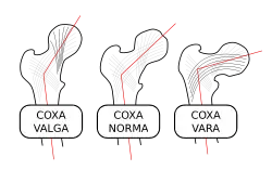 An abnormally small angle is known as coxa vara and an abnormally large angle as coxa valga. Because changes in shape of the femur naturally affects the knee, coxa valga is often combined with genu varum (bow-leggedness), while coxa vara leads to genu valgum (knock-knees).[19]