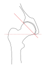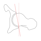 • The transverse angle of the acetabular inlet (also called Sharp's angle and is generally the angle referred to by acetabular angle without further specification)[8] can be determined by measuring the angle between a line passing from the superior to the inferior acetabular rim and the horizontal plane; an angle which normally measures 51° at birth and 40° in adults, and which affects the acetabular lateral coverage of the femoral head and several other parameters.[9]