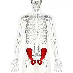 The two hip bones join at the pubic symphysis and together with the sacrum and coccyx (the pelvic part of the spine) comprise the skeletal component of the pelvis – the pelvic girdle which surrounds the pelvic cavity. They are connected to the sacrum, which is part of the axial skeleton, at the sacroiliac joint. Each hip bone is connected to the corresponding femur (thigh bone) (forming the primary connection between the bones of the lower limb and the axial skeleton) through the large ball and socket joint of the hip.[2]